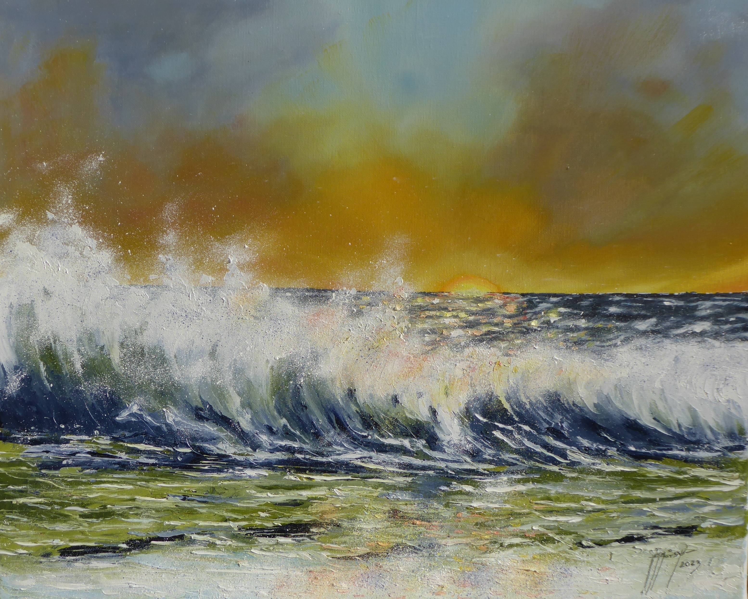 Peinture au couteau à l'huile sur châssis entoilé, bord de plage un jour très claire ou la mer était très houleuse, quelques rochers brun foncé sur coté gauche contrastant avec une mer très bleu et des vagues aux écumes blanches.